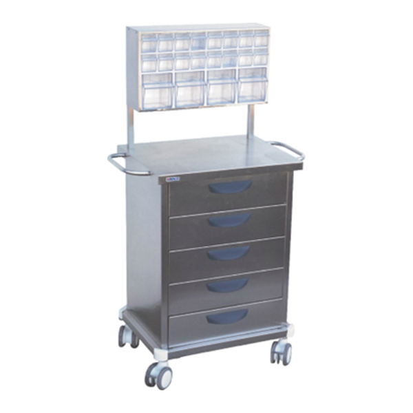 - Bins e gavetas em inox: compartimentos organizados para medicações e materiais.